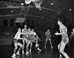 Sam Houston's Tom Sewell grabs loose ball in game with Texas Wesleyan as Ram's Paul Prater makes stab at it. That's Al Adams (39) of Sam Houston and TWC' Jerry Buck (behind Sewell).