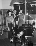 Suzy Smith, left, daughter of Mr. and Mrs. Bert K. Smith Jr. lived at 2329 Medford Ct. W., and Jan Evans, daughter of Mr. and Mrs. A. O. Evans, lived at 2417 Stadium Drive, members of the Musagetes, inspect the orthopedic and surgical table presented to the club. With them is Frank Gabriel, administrator of the hospital.
