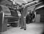 New fieldhouse for Fort Worth Public Schools. Alvin Chrisman, assistant athletic director, checks laundry facilities in basement. Published in Fort Worth Star-Telegram evening edition, December 11, 1953.