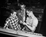 Halfback Jim Bowlin, left, and Quarterback Jack Evans, right, get type tips from coach Jack Whitley who instructs in printing as well as football. Whitley's masons play Newcastle at Graham for Region 3-B grid championship.