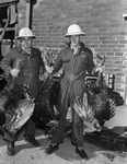 Fort Worth Emergency Corps President C. D. Hoeflin, left, and Member Bill Rotton hold turkeys that were prizes in the corps' turkey shoots December 13 to 20, 1953.