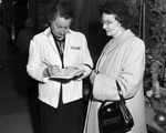 Mrs. Helen A. Thomas of 4109 Lovell, left, was willing at Throckmorton when Mrs. E. T. Harlow, right, asked her if she would like to sign a petition opposing a bus fare increase to 20 cents.