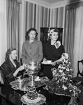 Miss Kitty Wingo, left, seated, poured tea at the Christmas party of the TCU Women Exes held in the home of Mrs. Claxton Lovin, 2928 Alton. Shown with Miss Wingo, left to right, are Mrs. Stuart F. Hendricks, a member of the house party, and Mrs. H. Guy Moore, who told a Christmas story.
