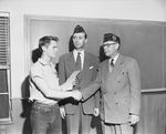 Joe Bagby, 16, of Boys Ranch near Bedford was presented with an American Legion certificate for distinguished service by State Senator Keith Kelly, center. The award was made by Post 14, headed by Commander S. H. Oliver, right.