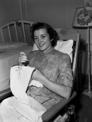 Shirley Evans, 15 years old sophomore student at Arlington High School, goes back to her own stitching and needle work, after surgeons removed a tumor "as big as volley ball" from her abdomen. The mass weighted five to six pounds. Surgeons says this is a tumor type rarely seen in the liver. It was so rare that it is not recorded in 15 major medical textbooks. She is at St. Joseph's Hospital. Shirley Evans is seating sewing.