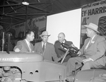 Massey-Harris dealers inspect one of the more than 20 new models of farm equipment for 1954. Left to right are W. A. Coleman, dealer at San Antonio, B. T. Saxton, general manager of the Dallas branch of the company, and W. M. Shadix, dealer at Abilene. An unidentified man is sitting in a tractor near them. Published in Fort Worth Star-Telegram morning edition December 15, 1953.