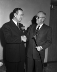 Dr. Joe White, right, receives congratulations from Dr. William Crawford, president of the Tarrant County Medical Society, after winning the society's gold-headed cane award. Published in Fort Worth Star-Telegram evening edition, December 16, 1953.