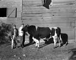 Bud Hayes poses Carnation Show master, a 6-year-old Holstein bull that is the main herd sire in the family's Parker County dairy herd.