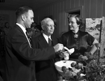 Dan E. Lydick, center, Chairman of the Board, was honored on his 75th birthday with a surprise party given by his son-in-law and daughter, Mr. and Mrs. Elvin Jones, at their home, 4429 El Campo. Guests were 50 employees of the Union Bank and Trust Company and their wives or husbands.