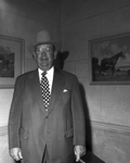Portrait of W. R. Watt, stock Show President and Manager, dressed in a suit, polka dotted tie and a hat. Published in Fort Worth Star-Telegram evening edition May 10, 1950.