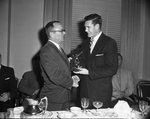 Dutch Meyer, Ray McKown, and L. R. Meyer. Two men are standing up next to a dinner table smiling and shaking hands wearing suites. There is a man in the corner looking at them standing on the left.