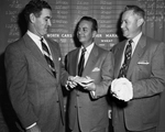 Stuart Lydick, center, vice president of the First National Bank, accepts a warehouse receipt from Ben Ferguson, left, auctioneer, after bidding $575 for a bale of cotton on behalf of the Goodfellow Fund. John F. Geis, right, also a vice president of the bank, holds a sample of the cotton.