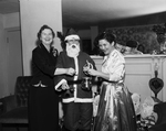 Mrs. Roby Smith, a member of the auxiliary of Fort Worth Independent Automobile Dealers Association, played Santa during a silver tea the auxiliary sponsored for the Goodfellow Fund. Shown contributing are Mrs. O. W. Conditt, left, and Mrs. Ray Williams.