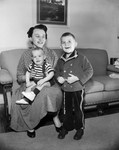 Mrs. Robert Hedeen and children, Michael, sitting in his mother's lap, and Robert Jr., right, left for France to join Lieutenant Hedeen, commander of the 498th Medical Service Company. Mrs. Hedeen is the daughter of Mrs. James Leonard, 5544 Jewell. Published in Fort Worth Star-Telegram morning edition, December 18, 1953.