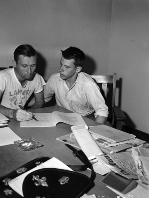 Laneri High School's 1950 senior class valedictorian, left, Roman Widacki- 27-year-old veteran- checks with the class salutatorian, Robert McGill, 17, on the addresses they delivered. Graduation exercises will be at the Woman's Club. Published in Fort Worth Star-Telegram evening edition May 9, 1950.
