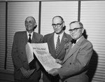 J. L. Clements, left, and R. D. Mitchell, center were honored at a surprise party Friday night given by fellow Santa Fe Railway workers. O. D. Crill, right, Fort Worth division superintendent, is holding one of the scrolls given the men who will retire soon. The three men are standing next to each other holding a document.
