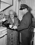 W. C. Ketzler, bus driver for Fort Worth Transit Company, gets cup of coffee from Mrs. Oma Pennock. The 74-year-old woman greeted more than 200 bus drivers- whom she calls "my boys"- Sunday during her 21th annual Christmas party for drivers. "Ma" Pennock lives at 3400 Millet.