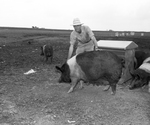 Image shows Cecil Stanford standing by Hampshire sow, center, Prairie Babs, which has cost $250. Three additional pigs are shown on the right and left. Published in the Fort Worth Star-Telegram morning edition, July 2, 1950.