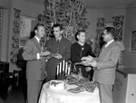 James R. Shute, right, new president of the Fort Worth Armed Forces Center, gives a Christmas stocking from the center to R. E. Claywell, who was delayed in Fort Worth while en route from San Diego, California to Florida. J. Stuart Lydick, past president, left, also offers a present to Clifford J. Neese of Linden, airman third class at Carswell Air Force Base. Published in Fort Worth Star-Telegram morning edition, December 25, 1953.