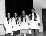 Among the members of the newly organized Bell Choir of Hemphill Presbyterian Church, which made its first appearance at a Christmas worship service are, from left, Burrel Deaton, Ida Ann Irwin, Barbara Barr, and Johnie Herbert Jr. Published in Fort Worth Star-Telegram evening edition, December 23, 1953.