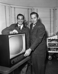 J. E. Pendleton, left, and O. W. Cleveland, Quartermaster Depot employees, try out the television set they brought to City-County Hospital's pediatrics ward as a Christmas gift from the depot's clothing and equipage section of the stores division. Cleveland headed the section's committee to buy the set. Published in Fort Worth Star-Telegram morning edition, December 24, 1953.