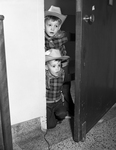 Stanky, 6, and Corky Burklow, 4, peek through a crack in the door of their father's room at Harris Hospital. The little boys visited their father briefly. He is Constable Deputy Bob Burklow who was critically wounded in a gun battle. The little boys' cowboy outfits were Christmas presents. Published in Fort Worth Star-Telegram morning edition, December 26, 1953.