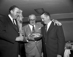 Ed Landreth, center, examines the prize he won for $500 with J. A. (Tiny) Gooch, left, auctioneer at the Exchange Club meeting where the Texas Christian University football was auctioned to raise money for the Goodfellow Fund and Santa Pals. George P. Hill, president of the club, is at right. Published in Fort Worth Star-Telegram morning edition, December 24, 1953.