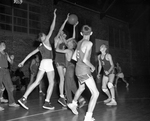 Robert Wood of Daggett Bulldogs hoists basketball out of harm's way as McLean Midgets' George Siddons (14) and Leland Phillips (wearing blue jeans) contest. Daggett's Larry Wood looks on at right. Daggett won 12-and-under title game in South Side Lions Club Tournament. Published in Fort Worth Star-Telegram morning edition December 23, 1953.