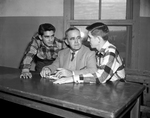 Captain R. H. Burks confers with two members of the Police Youth boxing team, Henry Mendez, left, and Joe Batson, right. Published in Fort Worth Star-Telegram morning edition, December 27, 1953.