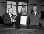 Ralph D. Martin, center, new federal jury commissioner for this division, inspects original jury box in use since 1896 with U. S. District Clerk George W. Parker (a federal officeholder for 58 years), left, and veteran U. S. Marshal Wright, whose office issues summonses for prospective petit or grand jurors. Published in Fort Worth Star-Telegram evening edition, December 24, 1953.