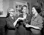 Donations for the Fort Worth Council for Retarded Children replaced exchange of gifts at a Christmas party given by Mr. and Mrs. Herman Jones at their home, 2144 S. Jennings, Christmas Eve. Making their contributions in a decorated brandy sniffer are, left to right, Mrs. Frank Bass of Abilene, Mrs. J. E. Madden of 4709 Calmont, and Mrs. G. A. Nowell of 2148 S. Jennings Ave. A total of $36.80 was collected. Published in Fort Worth Star-Telegram evening edition, December 24, 1953.