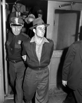 Desperado Norman Davenport is escorted into the Fort Worth jail by Traffic Sergeant Lawrence E. Wood, who helped arrest the Oklahoma prison escaper aboard a T&P train at Arlington. Davenport, who swore he'd never be taken alive, surrendered without struggle. Published in Fort Worth Star-Telegram morning edition, December 27, 1953.