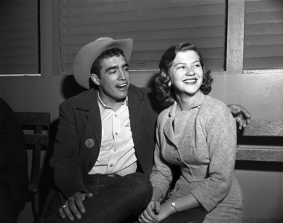 Texas Tech Halfback Bobby Cavazos and girl friend Nancy Chastain, Tech student from Breckenridge, get in brief visit during stop over en route to Jacksonville. Published in Fort Worth Star-Telegram morning edition, December 27, 1953.