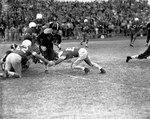 Scott Forney, Ranger quarterback, runs back an intercepted pass against Luling in the 1A title game. Tackling him are Gary Meyer (E2) and Johnny Barnett (E1). Published in Fort Worth Star-Telegram morning edition December 27, 1953.