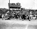 Billi Browning of Ranger darts through the Luling line at start of a 29-yard run in the game at San Marcos. Missing the tackle is Tommy Haley (B1), Luling back. Ranger won, 34-21. Published in Fort Worth Star-Telegram December 26, 1953.