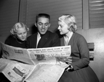 Elmer Wilson, 5-foot 4-inch Texas Tech back, chats with Sisters Sarah, left, and Patty Pinson during plane stop in Dallas en route to Jacksonville, Florida, for Gator Bowl football game New Year's Day. Published in Fort Worth Star-Telegram evening edition, December 26, 1953.
