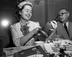 Margaret Hudson, left, made history when she received a "Sammy" at the annual Distinguished Salesmen's Award Banquet. The statuettes are awarded for top selling jobs during the year, and she was the first women ever to receive one. She is honored for Real Silk Hosiery Mills in 1953 and one the 20 sales leaders of the national organization this year. Published in Fort Worth Star-Telegram morning edition, December 30, 1953.