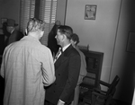 On December 7, 1953, Cecil Green, Sid Foley and Leroy "Tincy" Eggleston robbled a high-stakes poker game in Austin and apprehended by Austin police. In this picture Leroy (Tincy) Eggleston's face shows marks left by flying glass when his "pal," Sid Foley, shot at him. Eggleston stands by Cecil Green in the picture. Published in Fort Worth Star-Telegram evening edition, December 30, 1953.