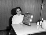 Catherine Gunn is shown with plaque she received from Fort Worth Hospital and Health council for her outstanding achivement.
