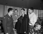 Lieutenant Richard Cavazos, left, Korean war hero and former Texas Tech grid man, congratulates Gator Bowl champions during reception at Amon Carter Field. Left to right are Centers Dwayne West and Ralph Martin, both of Fort Worth, and Tackle Barton Massey of Bowie. Cavazos is brother of Tech's star halfback, Bobby Cavazos. Published in Fort Worth Star-Telegram morning edition, Jan 3, 1954.