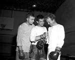 Middleweight Dick Price, left, and Light Heavyweight Bobby King, center, help Featherweight Bill Maines get ready for sparring session at Panther Boys Club. All three will compete in Regional Golden Gloves tournament. King's in high school class, Maines and Price in novice. Published in Fort Worth Star-Telegram evening edition January 7, 1954.