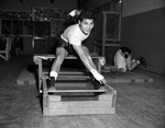 Featherweight Raymond Martinez stretches foe toes during workout at Golden Gloves Gym. He'll represent Carswell Air Force Base. Published in Fort Worth Star-Telegram evening edition January 8, 1954.