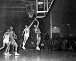 Texas' Gib Ford (31) twists for layup shot as Frogs' Buddy Brumley (23) tries in vain to block successful shot which helped Longhorns to 54-47 victory over TCU in SWC game. Published in Fort Worth Star-Telegram morning edition January 6, 1954.