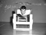 Bernie Ferguson, getting ready for the regional Gloves tournament, takes a turn on the push-up bars at the Panther Boys Club gymnasium. Published in Fort Worth Star-Telegram evening January 13, 1954.