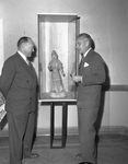 Frank Caro, New York, left, who with Fort Worth Art Association Director Dan Defenbacher, right, assembled an impressive exhibition of Chinese sculpture, is shown here at the show's preview in the Public Library gallery. In the case is a terra cotta figure, one of some 40 pieces in the show. Published in Fort Worth Star-Telegram evening January 06, 1954.