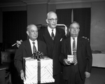 Two retiring officers of First National Bank, Coral E. Gillham, left, assistant vice president, and Frank W. Powell, right, vice president, receive best wishes and going-away gifts from J. Lee Johnson Jr., center, president. Published in Fort Worth Star-Telegram evening January 08, 1954.