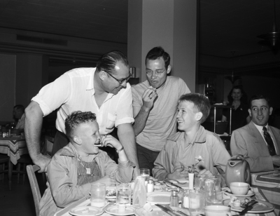 George M. Jennings, standing at left, is talking it over with three of his 112 Oklahoma City Times carrier-salesmen who ate breakfast in the Hotel Texas coffee shop, on their way home from a trip to Gavelston they won in a newspaper subscription contest. Seated are Jimmy Hick, left, and Tommy Morgan, both of Oklahoma City, and standing by Jennings is Sam Kasbaum of Norman. They started home early early from their four-day trip because of the impending railroad firemen's strike. Published in Fort Worth Star-Telegram evening edition May 10, 1950.