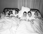 The six children of Mr. and Mrs. Elmer S. Mayes of Hurst were recovering in Fort Worth Osteopathic Hospital after all of them had their tonsils removed. They are left to right, Robert, Evelyn, Odus, Harry, Richard, and Thomas. Except for some slightly sore throats, they were reported doing fine. Published in Fort Worth Star-Telegram morning edition January 8, 1954.