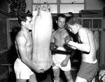 Light heavyweight Lonnie Flory, left, of Diamond Hill-Jarvis High School, holds bag while Teammate Dean Wright, a lightweight, watches, and Light heavyweight Rayburn Moyers looks on. They will compete in Star-Telegram's 18th Regional Golden Gloves Tournament Friday at Will Rogers Coliseum. Published in Fort Worth Star-Telegram evening January 11, 1954.