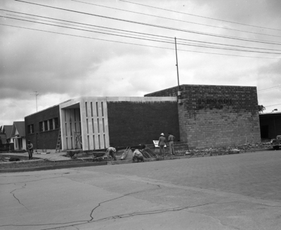 Workmen are shown putting finishing touches on the exterior of the U. S. government's newest "business" to be opened next month as the Berry Street Station, U. S. Post-office Department, at the southwest corner of Berry and Willing. Published in Fort Worth Star-Telegram evening edition May 12, 1950.